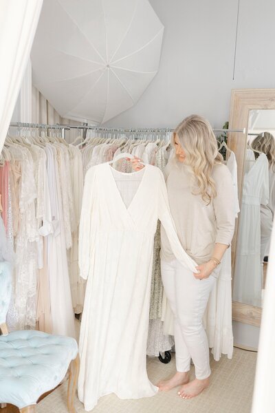 Boston Maternity Photography studio located on Newbury Street in Boston MA offering a studio wardrobe featuring a variety of maternity dresses, white lace robes and oversize white dress shirts to be worn with jeans.